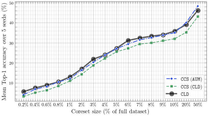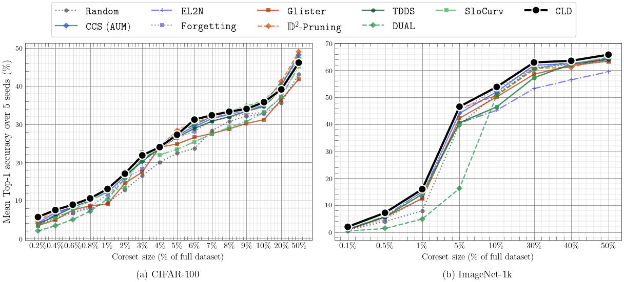 - Accuracy vs SOTA: CLD typically matches or outperforms score-based, optimization-based, and training-property baselines across subset sizes; when not leading, it’s usually within ~1% of the best.