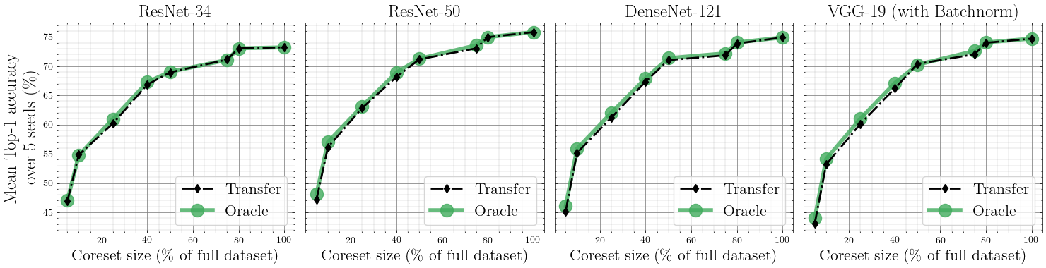 - Transferability: Coresets selected with ResNet-18 transfer to ResNet-34/50, VGG-19, DenseNet-121 with <~1% gap to that model’s own (“oracle”) selection.
