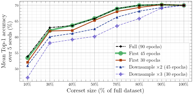 - Proxy model. A light backbone (ResNet-18) is enough to score; the coreset transfers well to bigger targets.