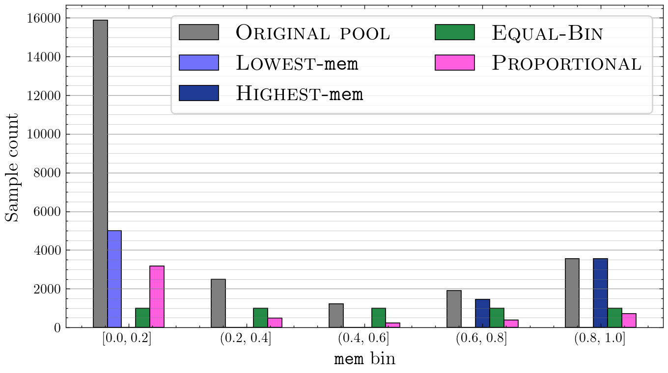 Changing the validation composition using memorization-based heuristics shifts downstream CLD performance. Proportional sampling to the pool is most reliable; highest-memorization-only tends to hurt, while a light mix can help long-tail behavior. The message: validation representativeness directly impacts CLD.