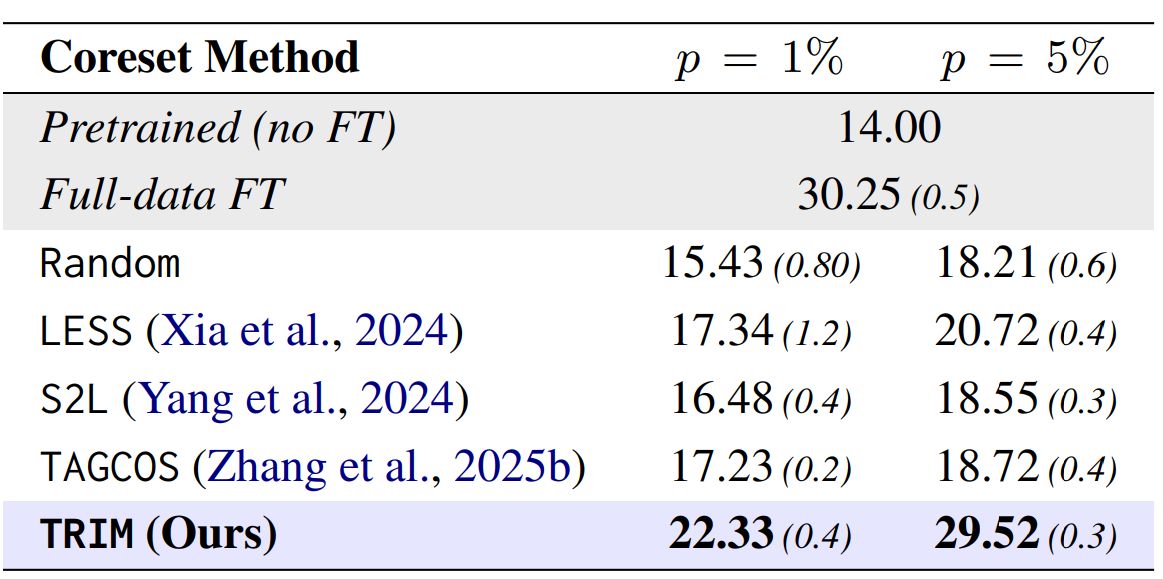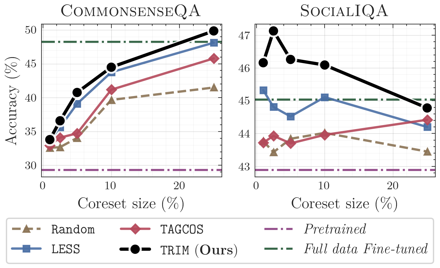- Budgeted accuracy (5%) — On LLAMA-3.2-1B, TRIM attains the best macro-average and is the only method whose 5% coresets surpass full-data on two tasks (SocialIQa and HellaSwag). Across budgets, TRIM consistently outperforms top baselines.