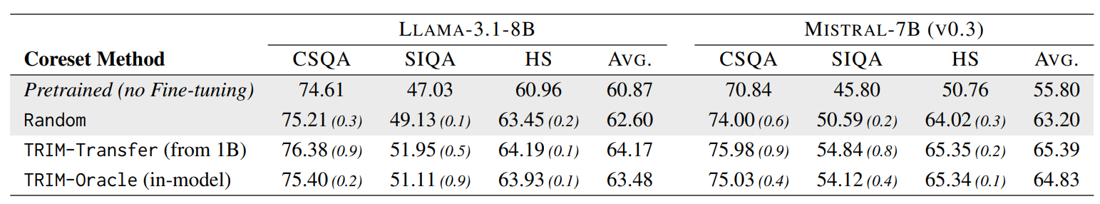 - Cross-model transfer — A single 5% coreset chosen by a 1B scorer transfers to LLAMA-3.1-8B and Mistral-7B, matching or beating the in-model oracle.