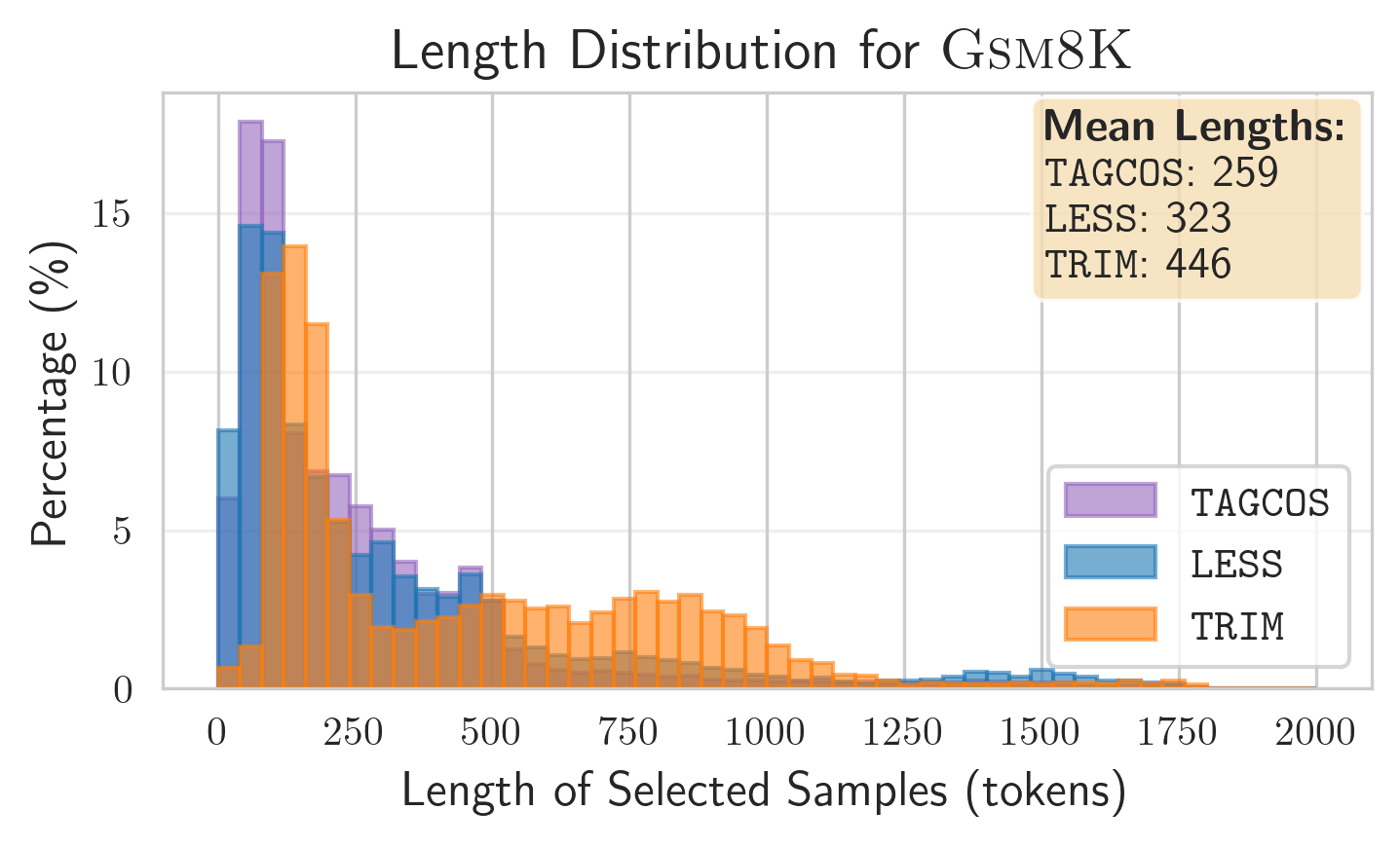 - Length bias — TRIM’s token-centric scoring is length-agnostic; selected examples are longer and richer than gradient baselines, avoiding the short-sequence bias.