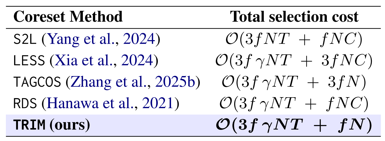 TRIM is forward-only at scoring time (one pass per candidate, single checkpoint), so the selection stage scales as $\mathcal{O}(fN)$ after a brief warmup. Gradient baselines (e.g., LESS/TAGCOS) require backward passes and/or multiple checkpoints $C$, pushing cost toward $\mathcal{O}(3fNC)$; trajectory methods (e.g., S2L) can require training on all candidates for logs. In practice, TRIM is orders of magnitude faster on large pools.